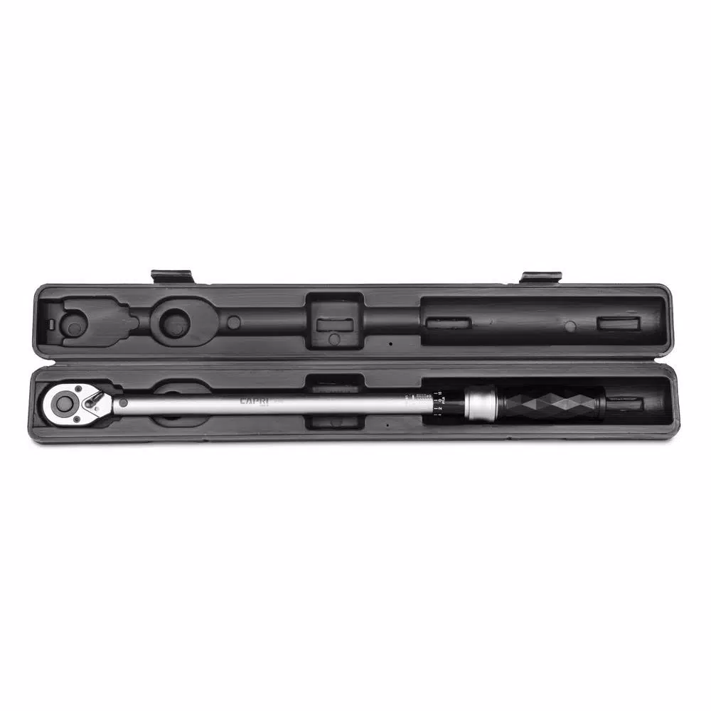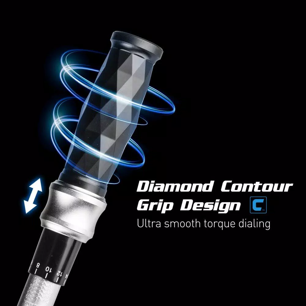 This Diamond Series torque wrench by Capri Tools features a diamond contour grip design that combines an ergonomic sure-grip and a lightweight impact resistant construction. The diamond contour grip is designed for a comfortable and steady hold. The handle is made of premium impact resistant materials which is 30% lighter than traditional torque wrench handles. Our spring loaded pull down ring and specially engineered ultra smooth torque dialing help you switch torque settings on the fly: simply pull down the ring, turn the handle, and release the ring. The positive lock mechanism secures the torque setting in place while you work. The quick release button helps you easily switch between bits and sockets. The engraved ft. lb. and newton meter dual scale provides a vivid and clear reading of the torque setting. Torque setting is available anywhere between 30 ft. lbs.-250 ft. lbs. or 54.2-325.4 newton meters, with torque tolerance at +/- 4%. Each one of our torque wrenches comes with a NIST traceable certificate of calibration, calibrated in accordance with ASME B107.300-2010 and ISO 6789:2003 standards. Comes with custom fitted high-impact case for storage.