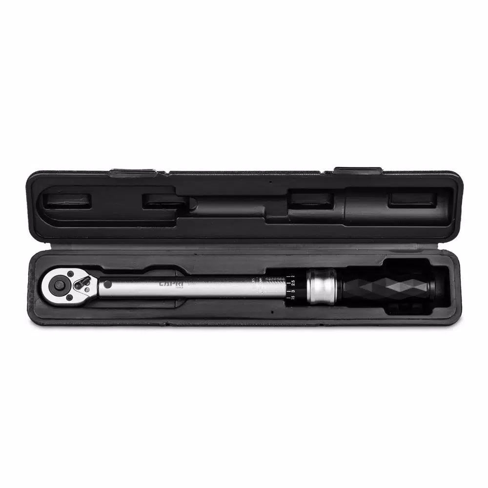 This Diamond Series torque wrench by Capri Tools features a diamond contour grip design that combines an ergonomic sure-grip and a lightweight impact resistant construction. The diamond contour grip is designed for a comfortable and steady hold. The handle is made of premium impact resistant materials which is 30% lighter than traditional torque wrench handles. Our spring loaded pull down ring and specially engineered ultra smooth torque dialing help you switch torque settings on the fly: simply pull down the ring, turn the handle, and release the ring. The positive lock mechanism secures the torque setting in place while you work. The quick release button helps you easily switch between bits and sockets. The engraved ft. lb. and newton meter dual scale provides a vivid and clear reading of the torque setting. Torque setting is available anywhere between 10 ft. lbs.- 80 ft. lbs. or 17-105.1 newton meters, with torque tolerance at +/- 4%. Each one of our torque wrenches comes with a NIST traceable certificate of calibration, calibrated in accordance with ASME B107.300-2010 and ISO 6789:2003 standards. Comes with custom fitted high-impact case for storage.