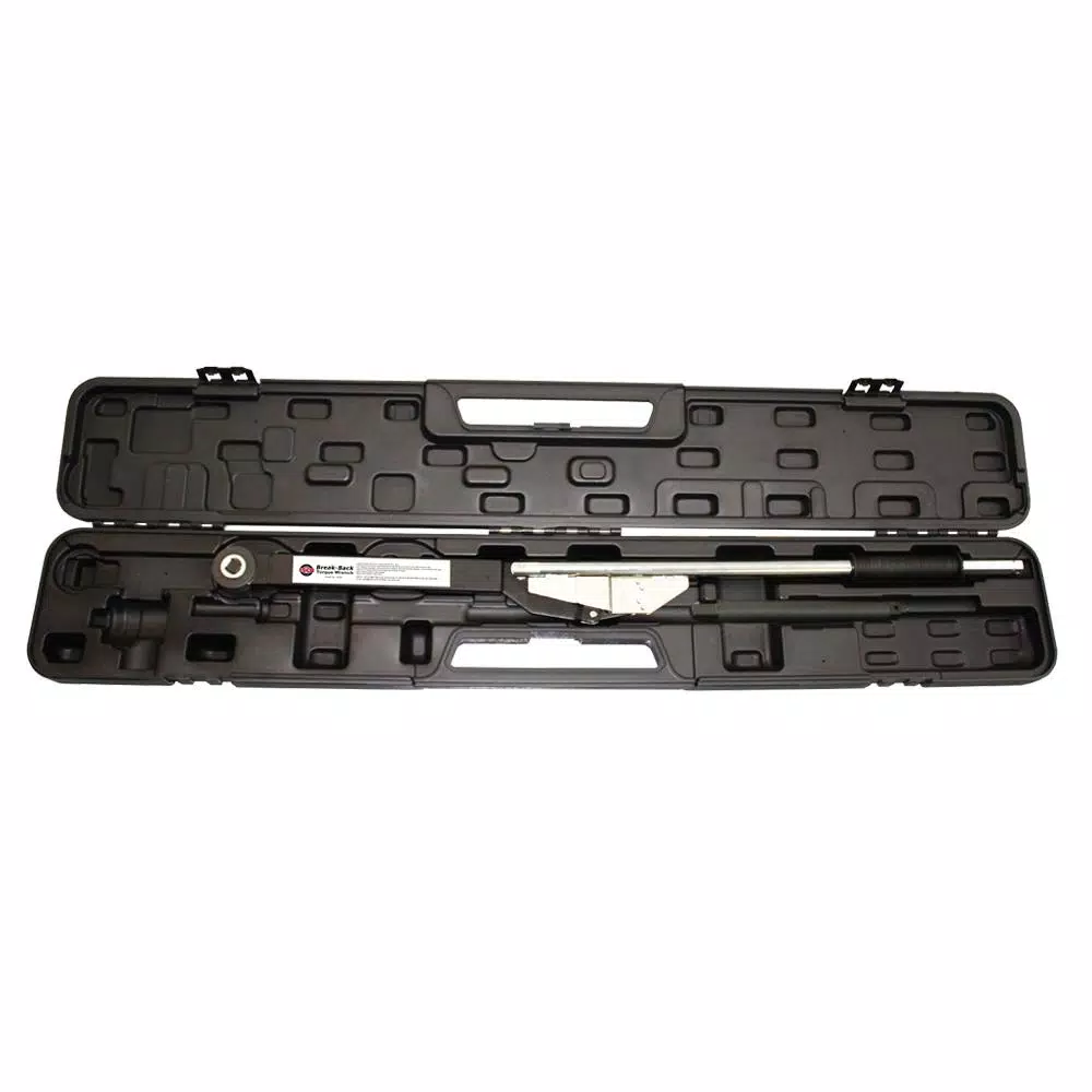 This professional grade break-back style torque wrench offers a 200 ft. โ 750 ft. lbs. range which can be used for many applications. Easily set an infinite range of torque values with extremely high accuracy by adjusting the dial on the handle to the desired torque value. When the preset torque value is reached, a reliable control mechanism allows the wrench to physically bend in the middle, which alerts the operator that torque has been met. This tool comes pre-calibrated to an accuracy of +/- 4%, ready to use right out of the box. Includes a heavy-duty molded carrying case for easy transport and storage.