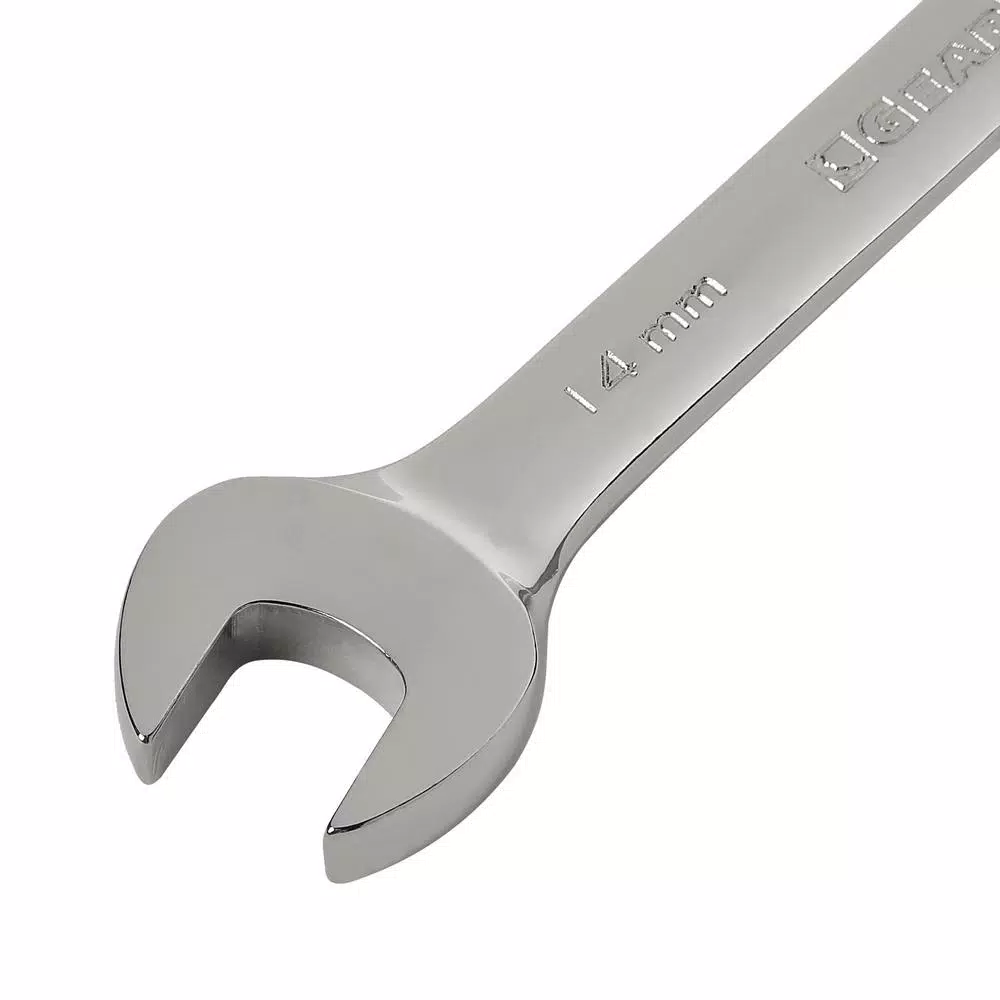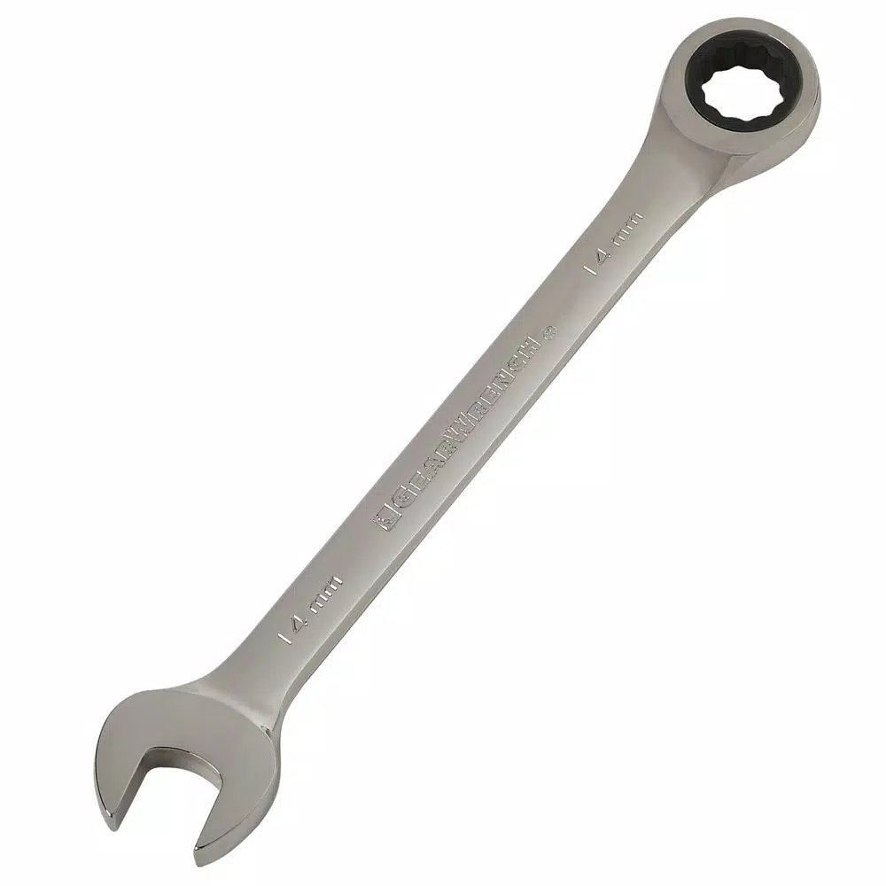 The GearWrench 14 mm Combination Ratcheting Wrench features a full chrome polish finish for durability and corrosion resistance. Ratcheting box end increases productivity while reducing hand fatigue. The box end utilizes Surface Drive technology which provides off-corner loading for better grip and reduced fastener rounding.