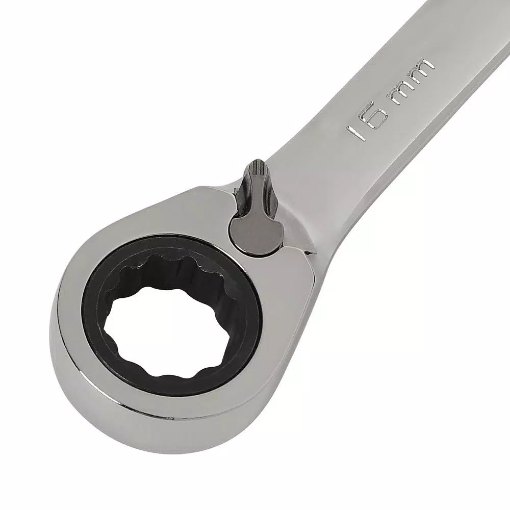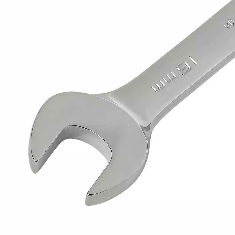 The GearWrench 16 mm Reversible Combination Ratcheting Wrench features a full chrome polish finish for durability and corrosion resistance. Ratcheting box end increases productivity while reducing hand fatigue. The box end utilizes Surface Drive technology which provides off-corner loading for better grip and reduced fastener rounding.
