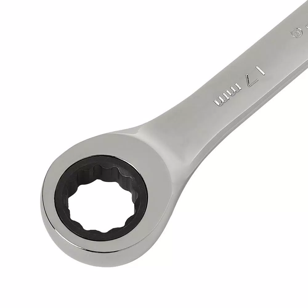 The GearWrench17mm Combination Ratcheting Wrench features a full chrome polish finish for durability and corrosion resistance. Ratcheting box end increases productivity while reducing hand fatigue. The box end utilizes Surface Drive technology which provides off-corner loading for better grip and reduced fastener rounding.
