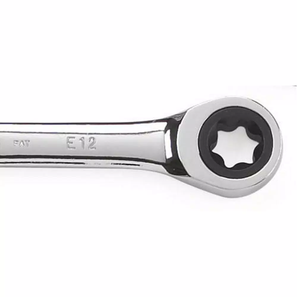 The GearWrench E10 x E12 E-Torx Ratcheting Double Box-end Wrench is ergonomically designed beam for comfort and leverage. Uses only 5ยฐ turns to move fastener vs. 30ยฐ of swing for tight access performance. High polish chrome finish and fully hardened forging for optimum performance. This wrench was made to work with E-Torx Fasteners.