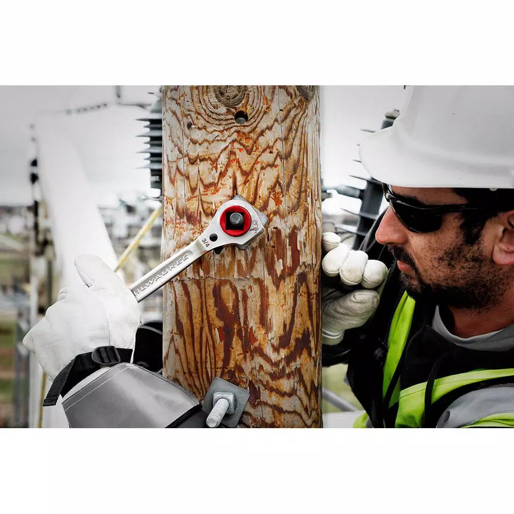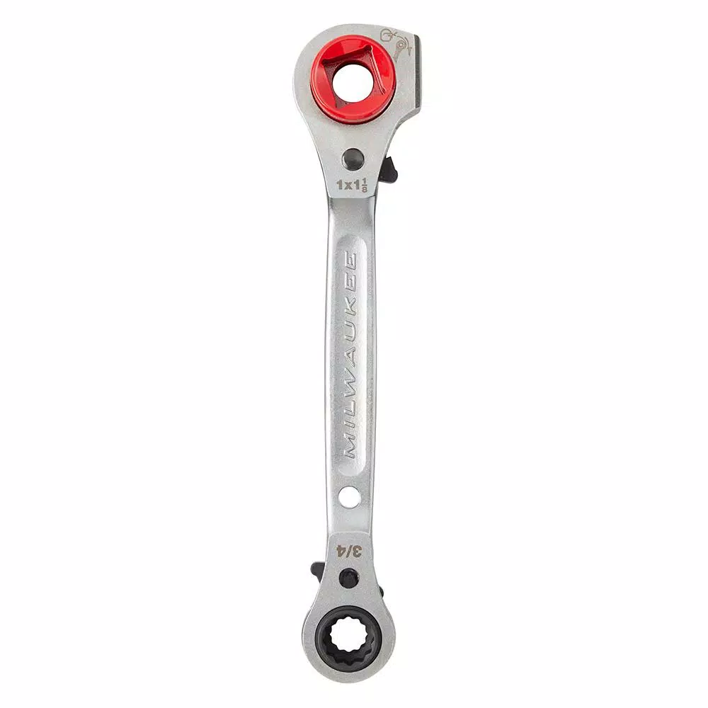 The Milwaukee Linemanβs 5-in-1 Ratcheting Wrench features the most durable ratchet. The ratcheting wrench has a built-in hammer providing users with a dedicated surface for hammering. It also has large directional switches that users can easily press while wearing gloves. It has a durable forged steel construction providing users with longer tool life. The high leverage wrench fits 3/4 in., 1 in. and 1-1/8 in. square hardware and 9/16 in. and 3/4 in. standard hardware.