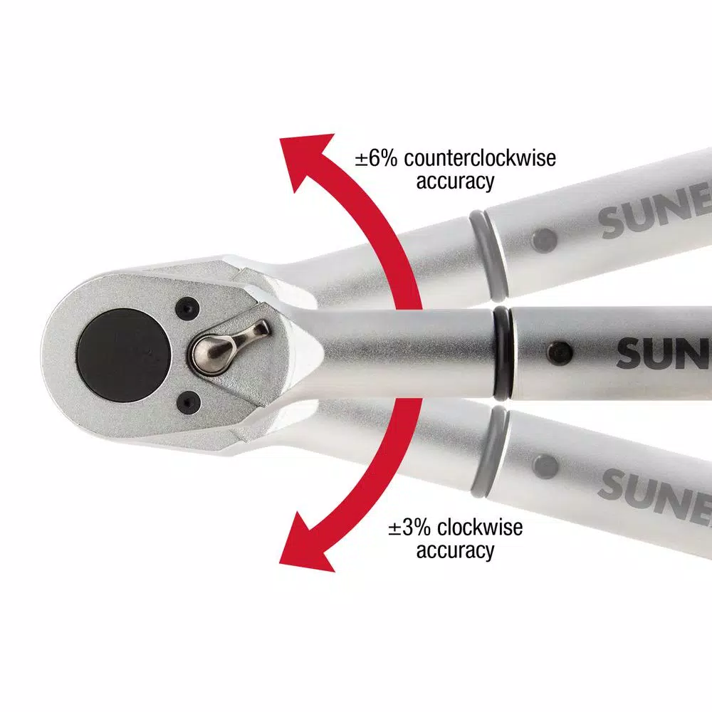 The Sunex 40600 ยพ in. Drive 100-600 ft.-lbs. 48T Torque Wrench has a 48 tooth ratcheting mechanism that is accurate to ยฑ3% clockwise and ยฑ6% counterclockwise. It is made of high quality internal components for professional performance and has a heat-treated tube with a knurled aluminum handle for a better grip. The Sunex 40600 is designed to signal the desired torque by an audible click and impulse. This torque wrench comes in a convenient storage case and includes a certificate of calibration.