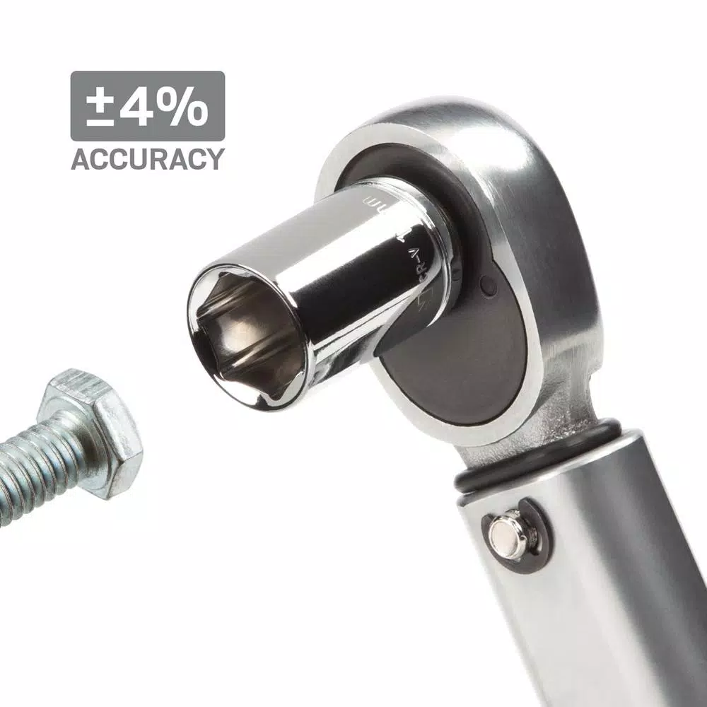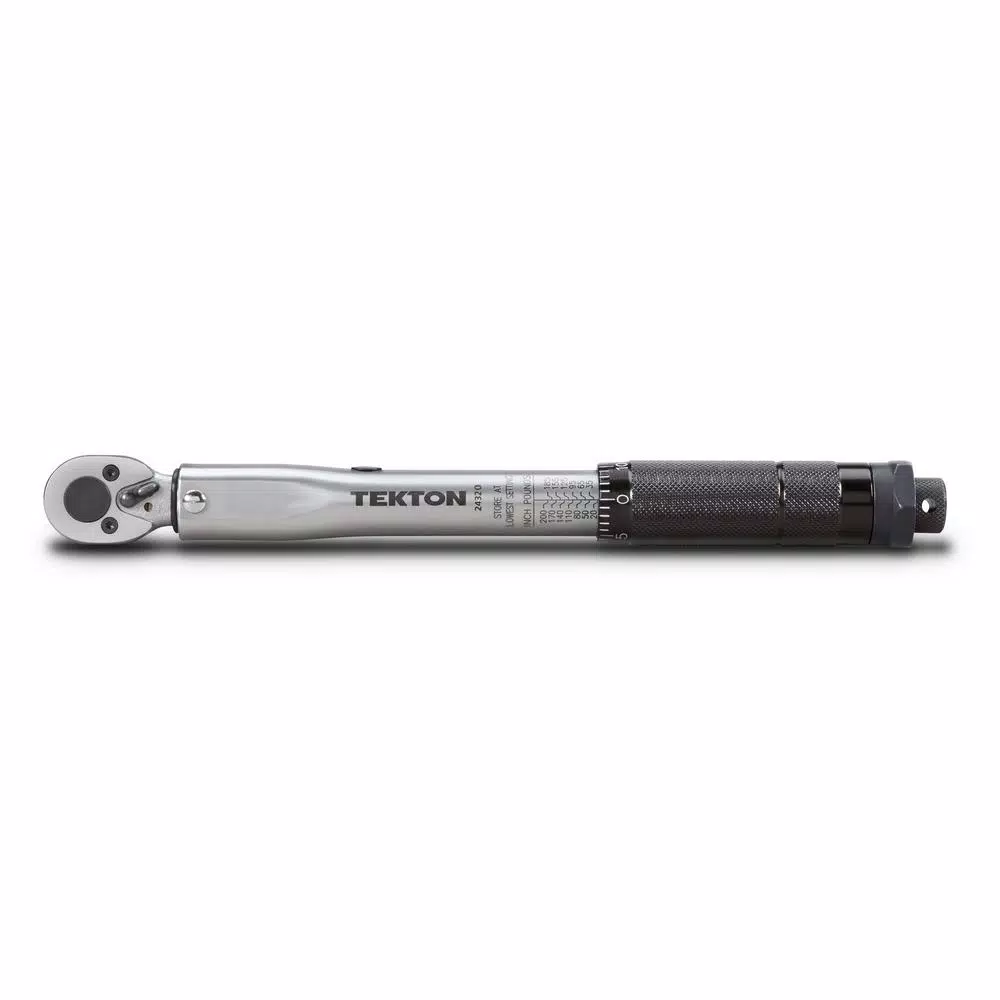 Calibrated to an accuracy of +/- 4%, the TEKTON 1/4 in. Drive Click Torque Wrench lets you work with confidence, eliminating guessing and the common tendency to overtighten fasteners. Correctly tightening fasteners to vehicle or equipment torque specifications ensures parts are properly secured without being damaged. Simple and easy to use, this wrench has a reversible ratcheting head that drives fasteners in both directions and measures torque in the clockwise direction. To measure torque, set the desired value on the handle scale (inch pounds or Newton meters) and begin tightening the fastener. When the preset torque value is reached, a reliable mechanical operation inside the handle produces a click you can hear and feel, alerting you to stop applying force. Built for consistent performance and years of dependable service, the mechanical design does not need batteries and the all-steel construction has no plastic parts to break or wear out. Important: This wrench is shipped pre-calibrated and ready to use. To help maintain calibration, store at its lowest setting of 20 in./lb. (2.2 Nm) when not in use. Be sure to read and understand the operatorβs manual, including all safety information, before first use.