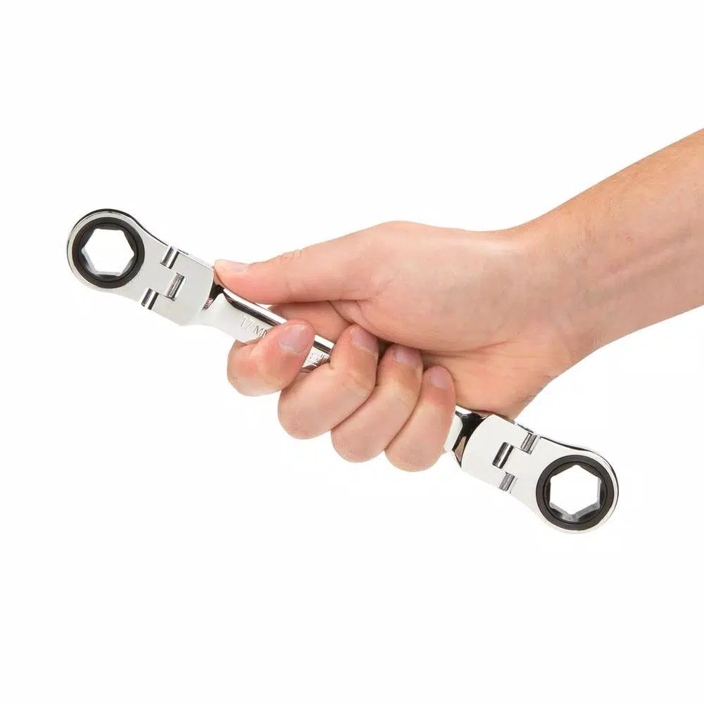Ideal for confined spaces, this TEKTON Flex-Head Ratcheting Box End Wrench stays engaged with fasteners, eliminating the need to re-fit after each turn.