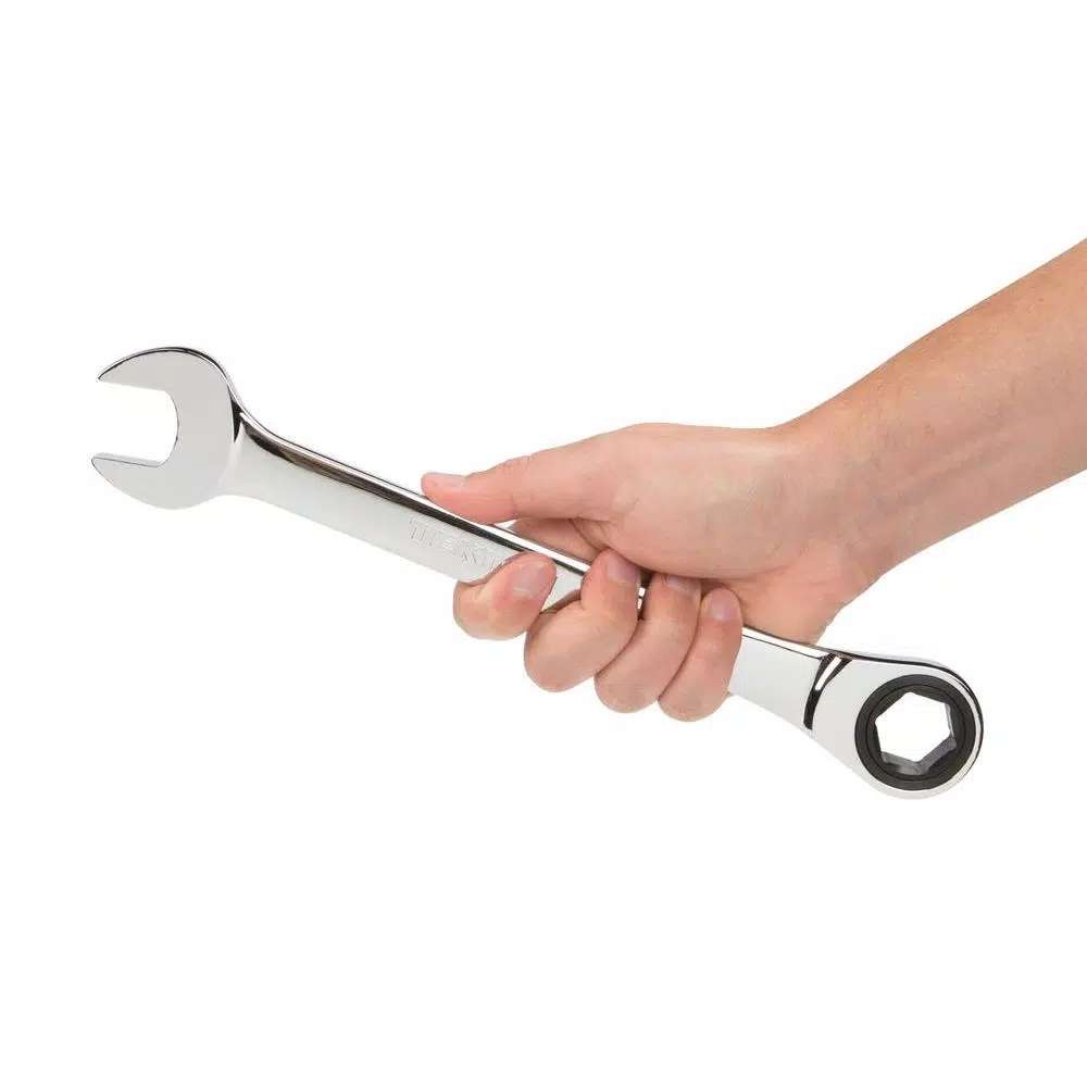 TEKTON Ratcheting Combination Wrenches offer the speed and ease of a ratcheting box end that stays continuously engaged with fasteners, eliminating the need to re-fit after each turn. A 6-point opening provides a sure, snug fit on hex-shaped fasteners so you can apply maximum torque without slipping off, preventing knuckle aggravation. To prevent round-off, the box end opening contacts and applies force to the flat sides of fastener heads rather than the corners. Equipped with a 72-tooth ratchet gear that needs just 5 degrees of swing arc to reach the next tooth position, it is fast and efficient when there is not much room to move. The open end is angled 15 degrees, allowing the wrench to be flipped over with each rotation to engage the fastener twice as often when you are working in tight spaces.