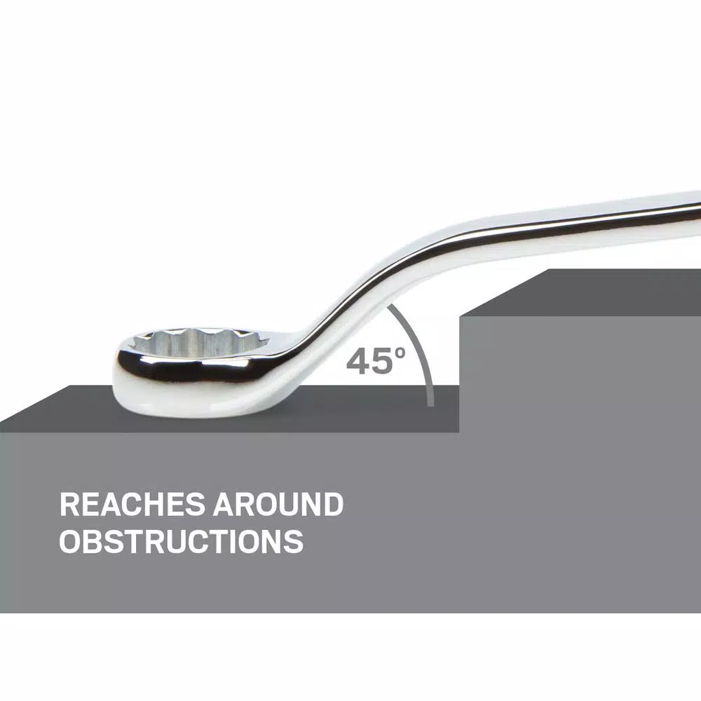 Generous Offset: Each end is offset 45°, creating plenty of clearance for your fingers and allowing an easy reach over and around obstructions. 12-Point Openings: Doubling the access angles of 6-point wrenches, these 12-point openings make it easier to work in tight spaces. Non-Rounding Geometry: To prevent damaging round-off, the geometry of each opening contacts and applies force to the flat sides of fastener heads rather than the corners.