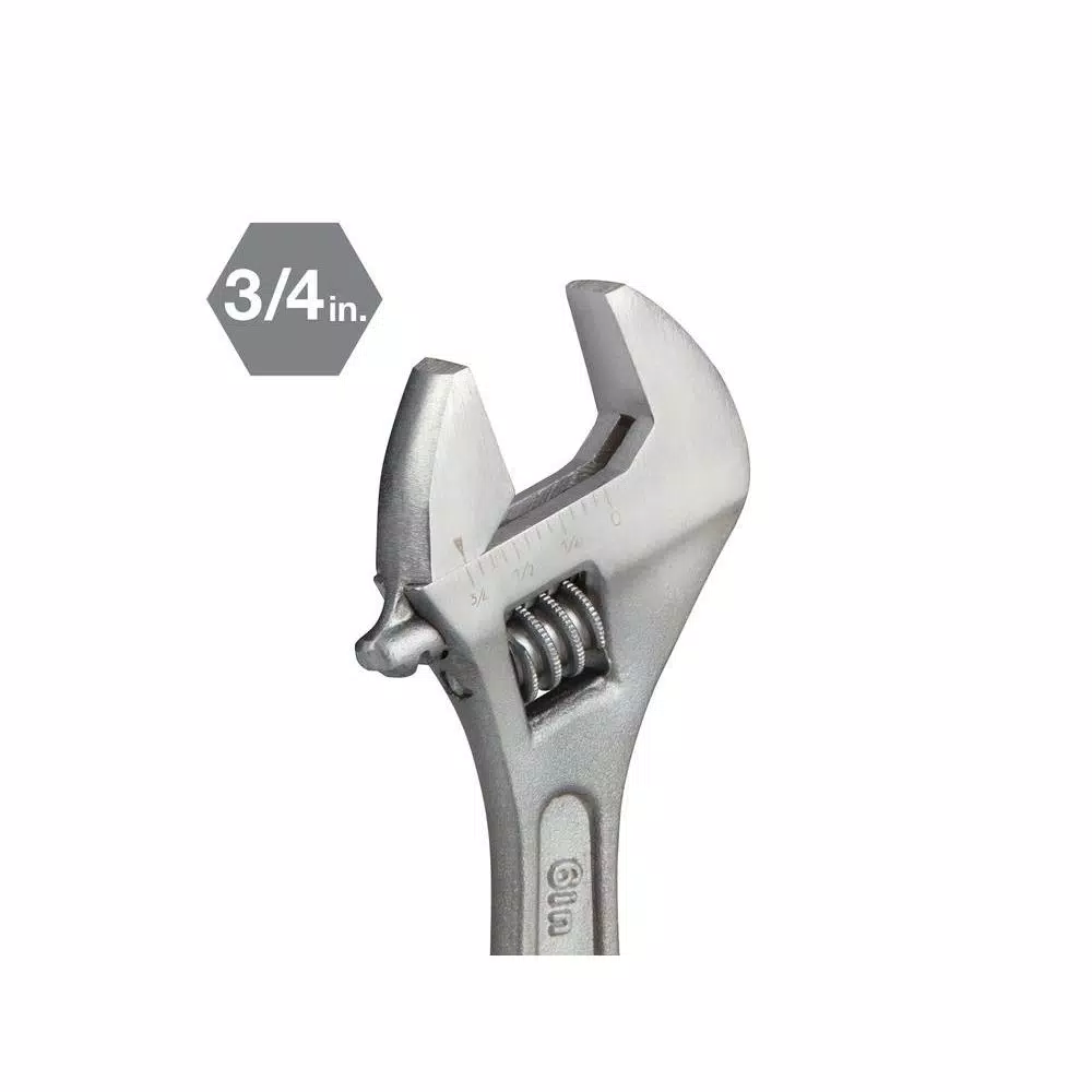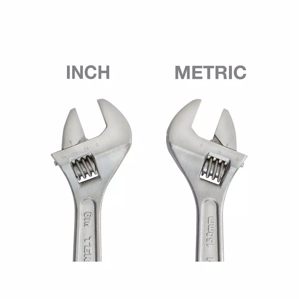 Designed for tight and hard-to-reach spaces, the TEKTON 6 in. Adjustable Wrench can take on bicycle repair and furniture assembly. It also works well to secure back nut or bolt while tightening or loosening front nut or bolt with a socket or combination wrench. TEKTON adjustable wrenches are designed to be versatile enough to tighten and loosen fasteners of various sizes without needing to grab other tools. Made from durable carbon steel with a corrosion-resistant satin chrome finish, our wrenches will become a permanent staple in your toolbox. Manufactured to strict quality specifications, TEKTON adjustable wrenches meet or exceed ANSI performance standards. Precision-machined for a tight fit, the slide jaw and worm gear contact in 3 spots for smooth operation and less play. Knurling on worm guide allows for quick jaw size adjustment. The satin finish keeps wrench looking like new by hiding scratch marks that can be seen in regular chrome finished wrenches. Jaw opening guide has permanent laser etched size markings in both metric and Inch scales. The dual Inch/metric scale is useful measuring the size of nuts and bolts. Each wrench displays a stamped length size and model number for distinction among your TEKTON adjustable wrenches.